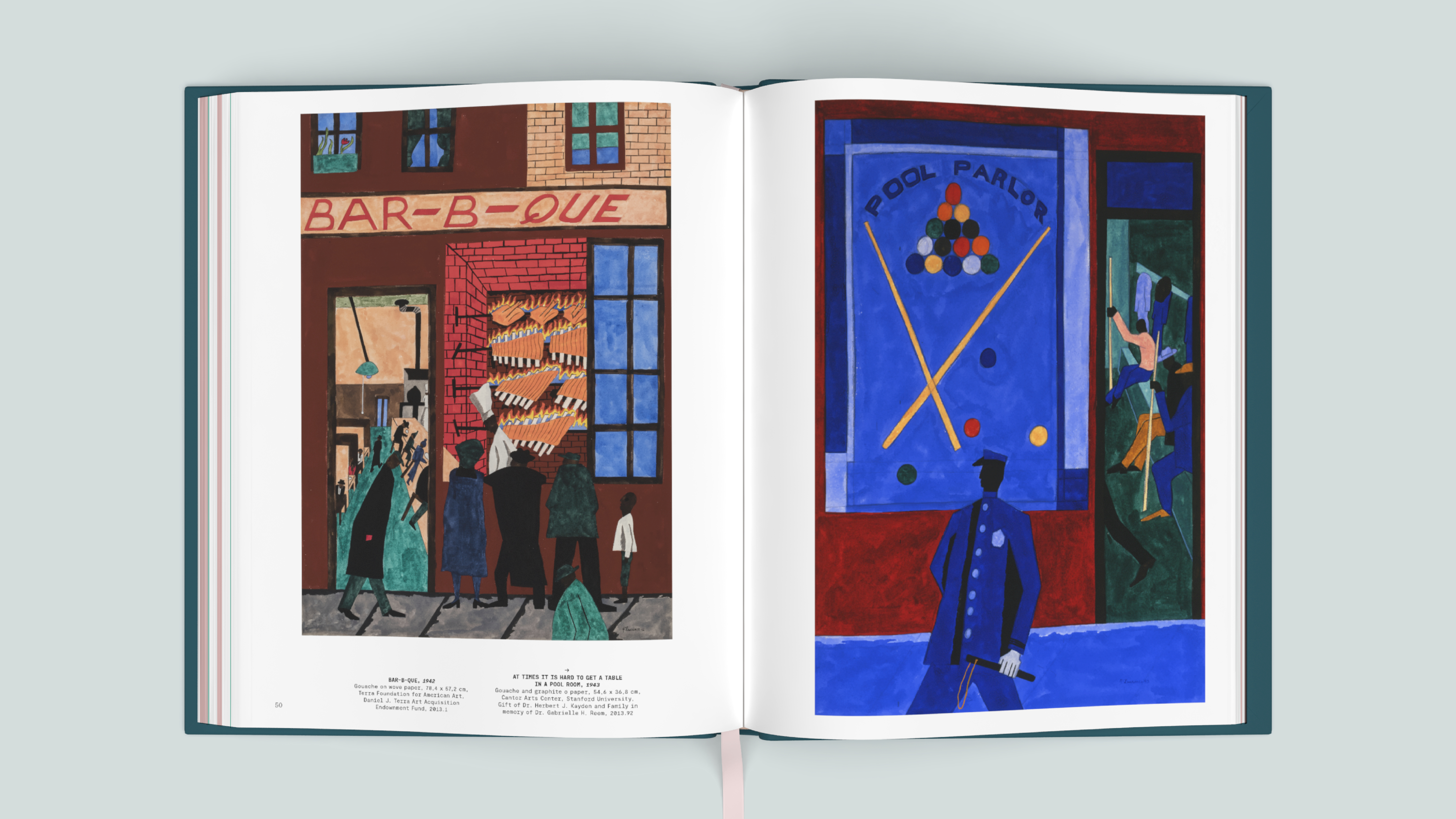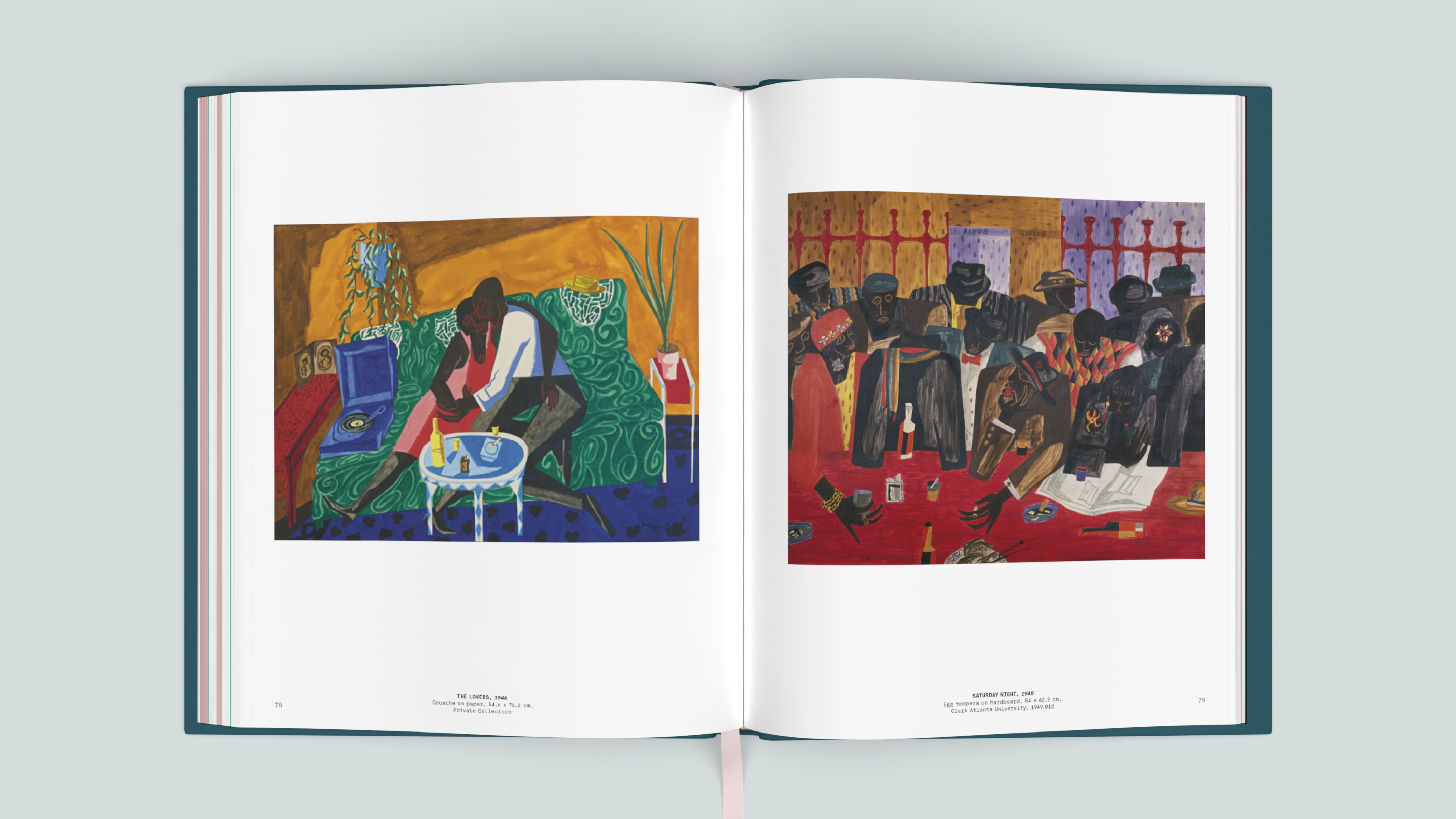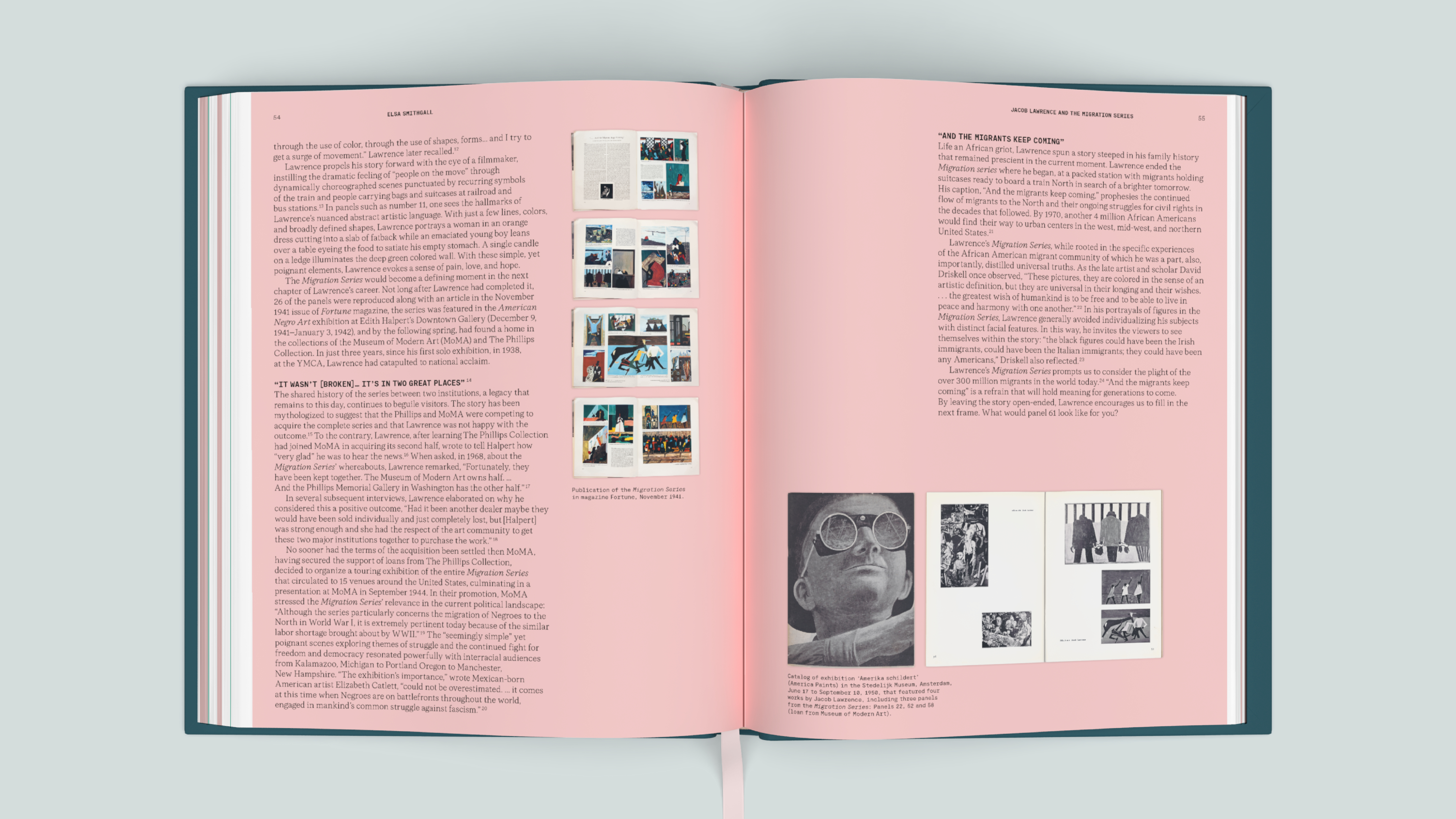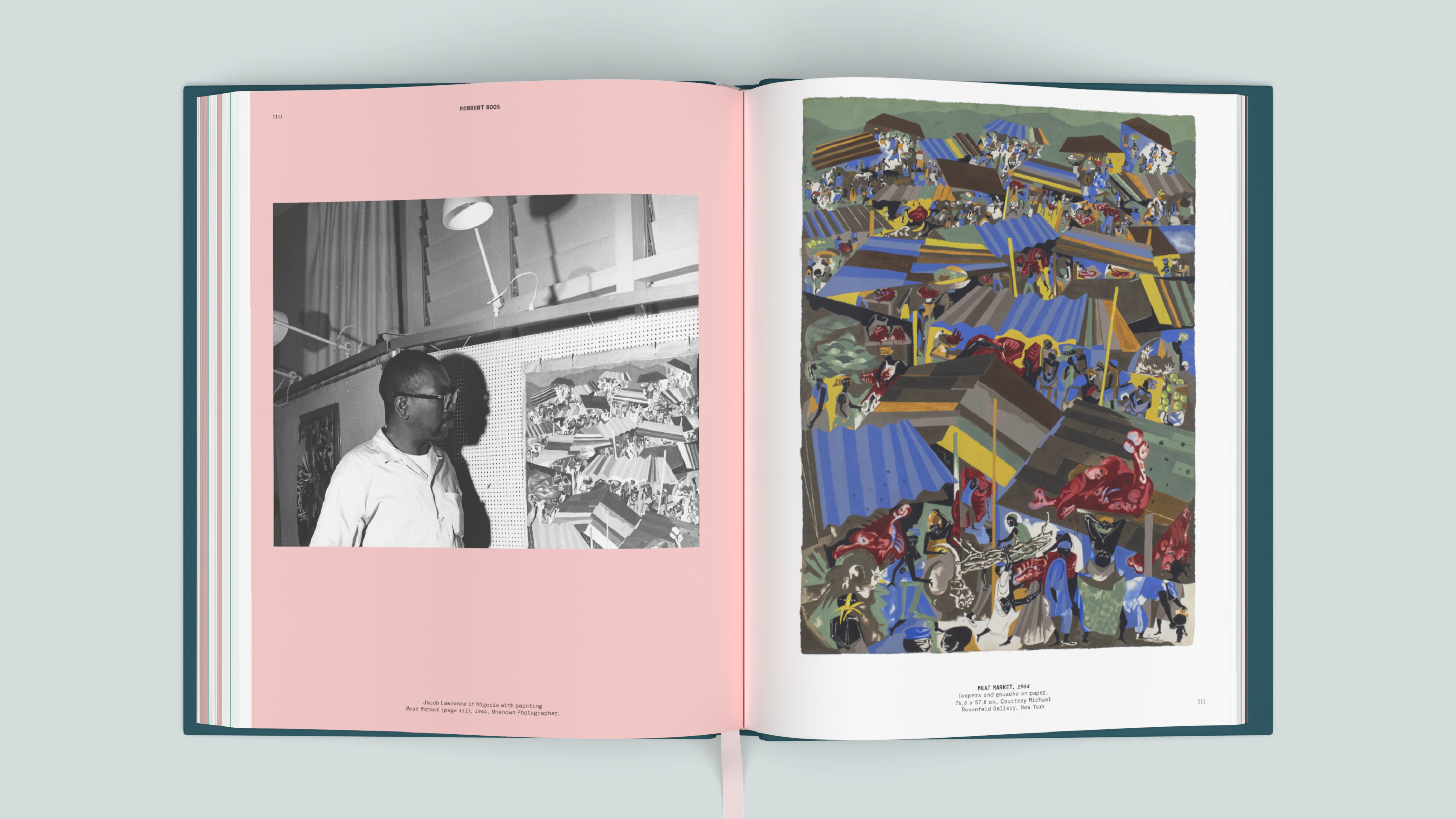 The carefully designed exhibition catalog, published in two languages, is a vibrant publication that showcases Lawrence's work prominently on its pages. The colors are directly inspired by Lawrence's palette: soft shades of pink and green in the interior combine with the powerful, saturated colors on the covers. The modern typography subtly references the era in which Lawrence worked; the monotype font echoes the graphic notes from his sketchbooks.