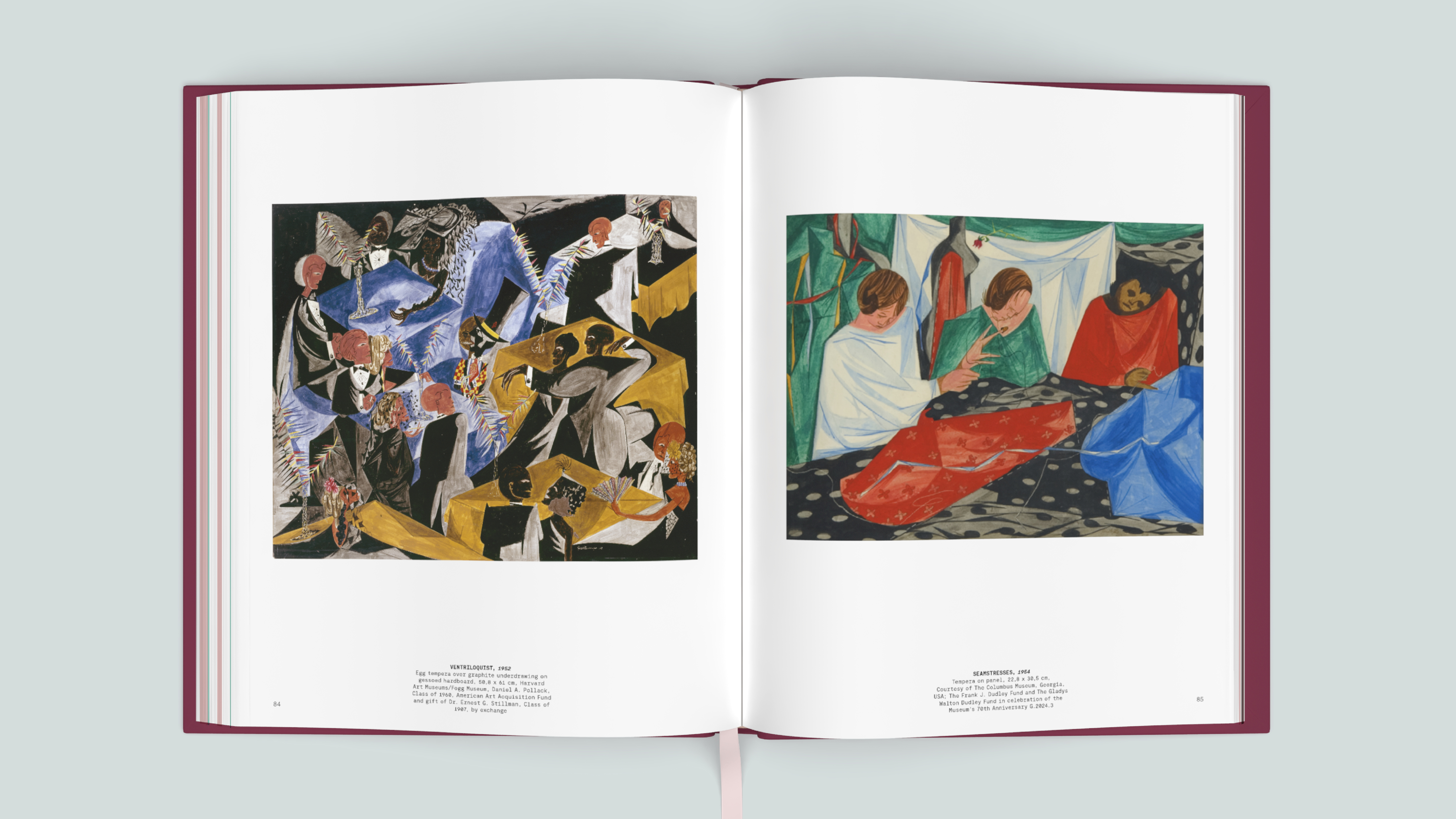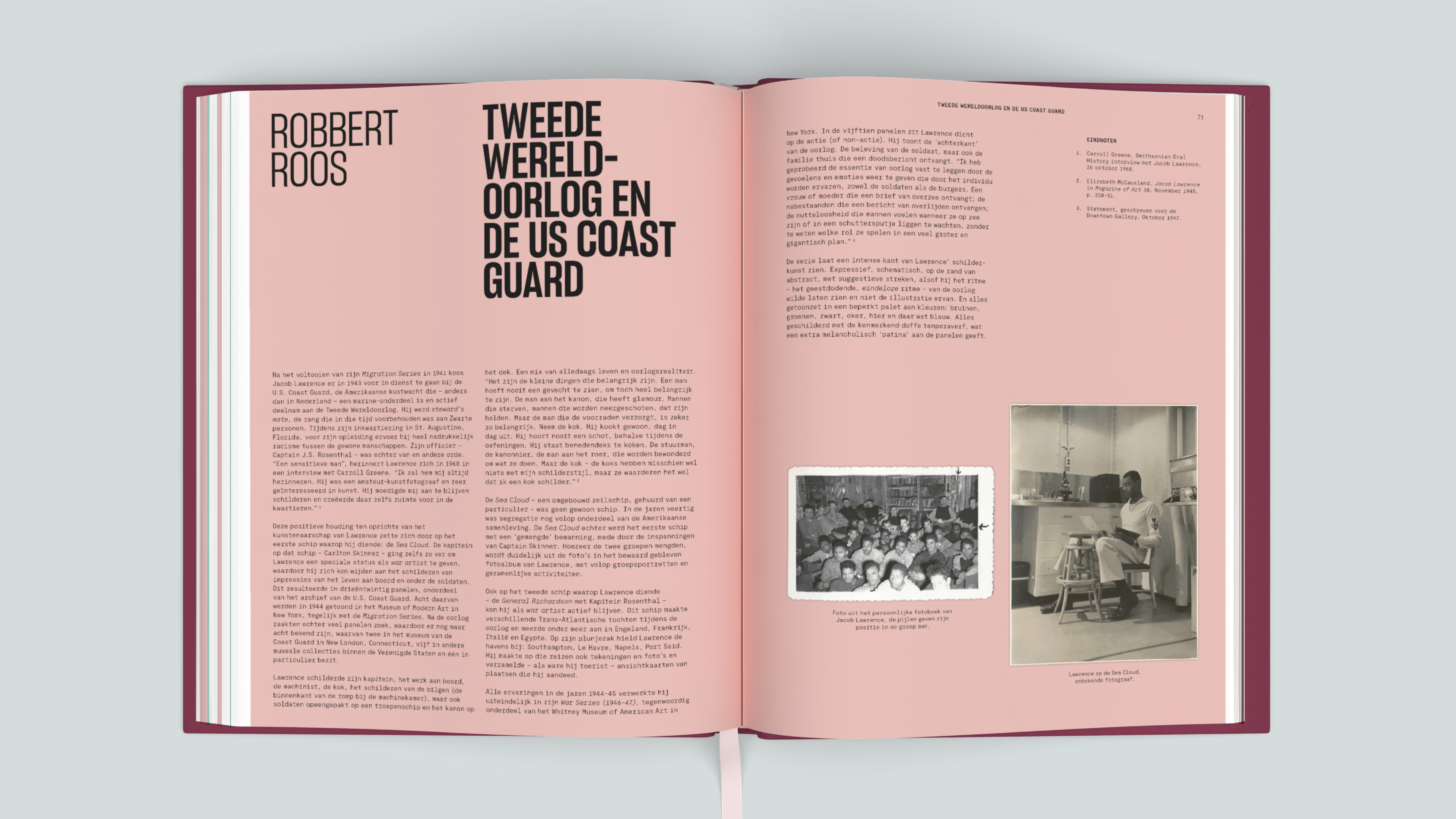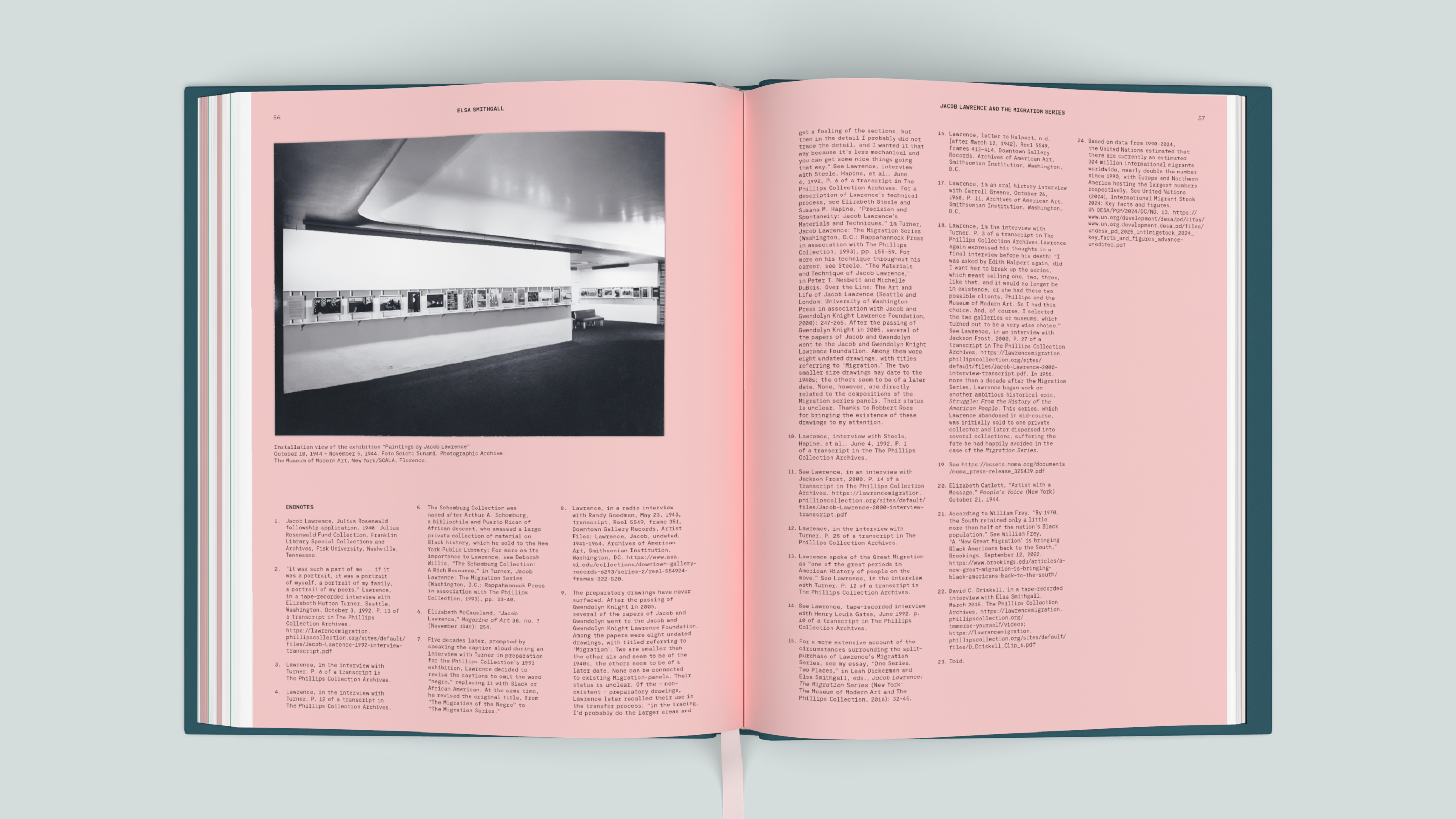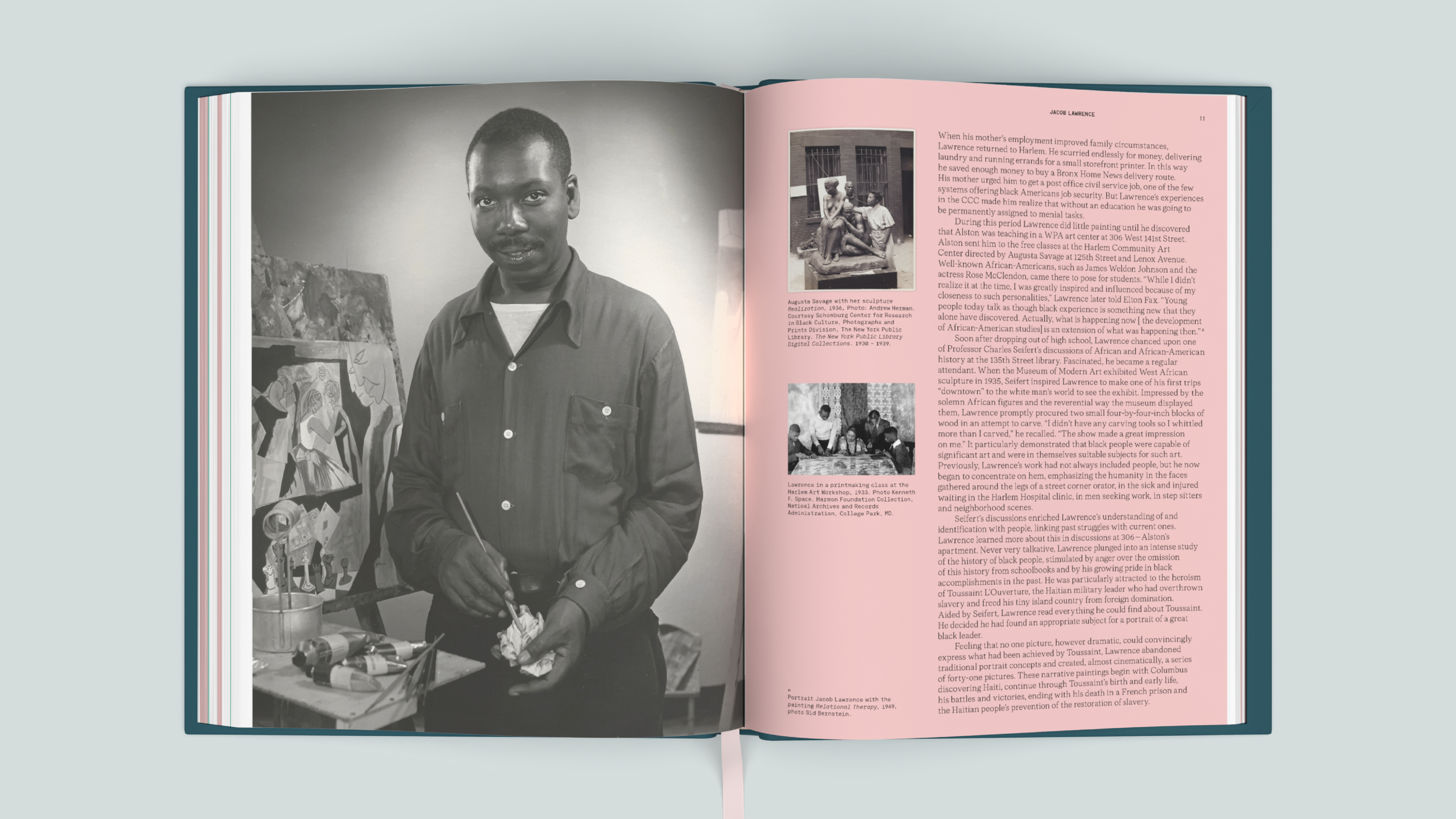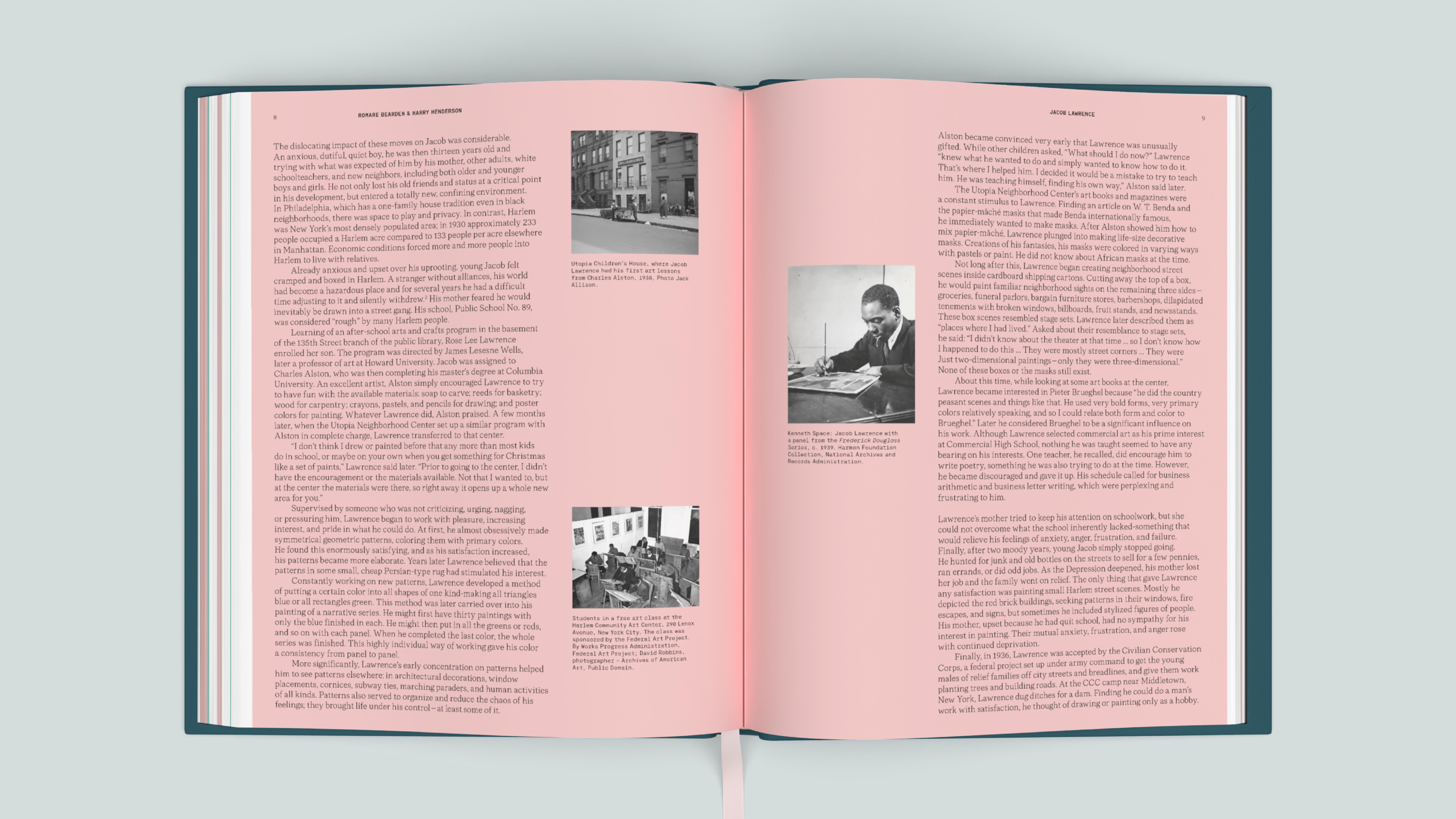 The carefully designed exhibition catalog, published in two languages, is a vibrant publication that showcases Lawrence's work prominently on its pages. The colors are directly inspired by Lawrence's palette: soft shades of pink and green in the interior combine with the powerful, saturated colors on the covers. The modern typography subtly references the era in which Lawrence worked; the monotype font echoes the graphic notes from his sketchbooks.